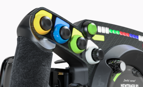 D’un diamètre de 310mm, d’un écran de 3.4 pouces et avec une plaque avant en fibre de carbone de 5mm d’épaisseur, ce dernier proposera également une multitude de boutons. 8 Boutons poussoirs, deux switchs joystick FunkySwitch à 7 voies, deux roulettes au niveau des pouces, ainsi que 4 boutons rotatifs et poussoir au niveau de l’écran. De quoi pouvoir se passer aisément d’une button box pour la plupart des simracers.