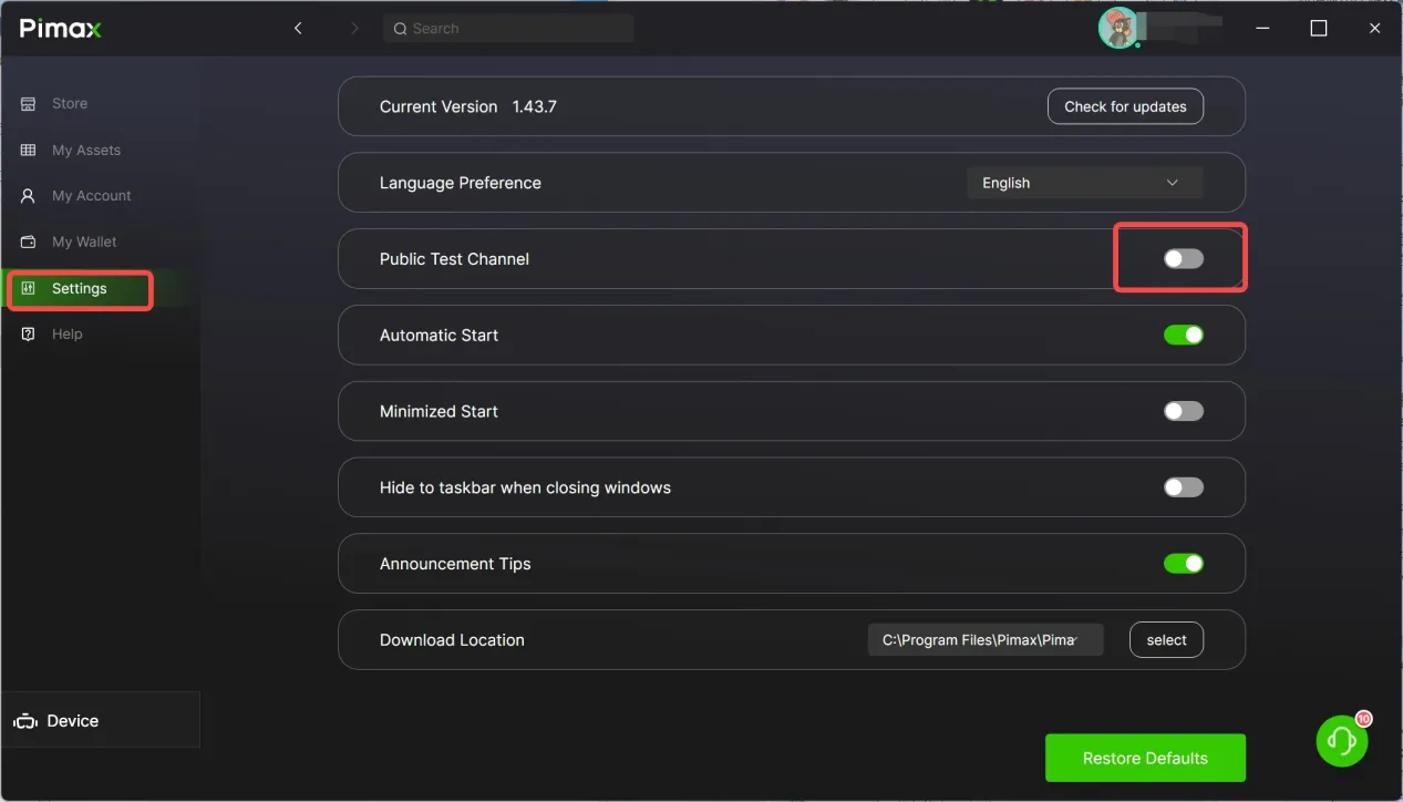 Le déploiement se fait progressivement sur deux semaines. Pour l’obtenir immédiatement, activez l’option « Public Test Channel » dans les paramètres de PimaxPlay (Settings → Public Test Channel).